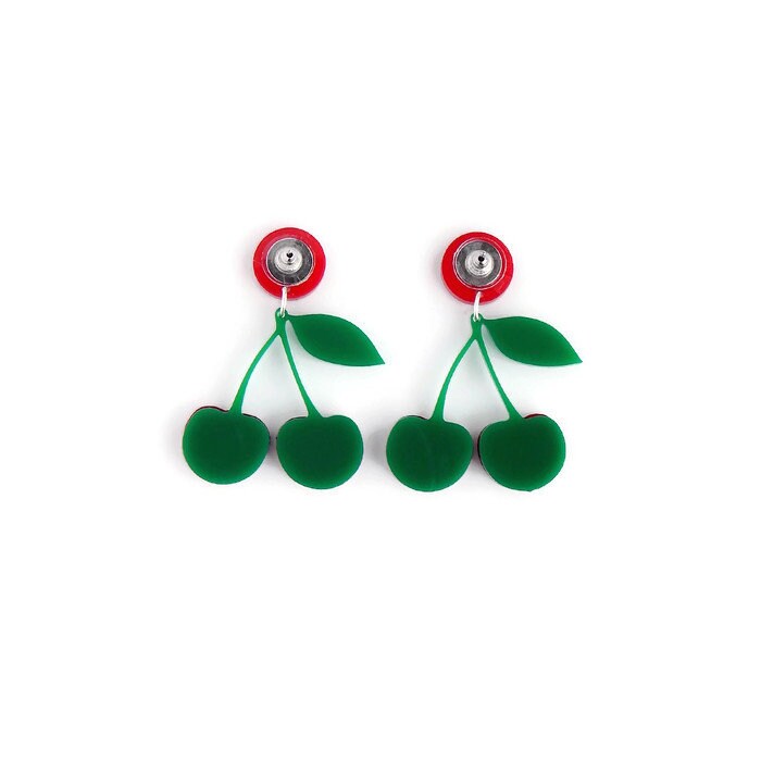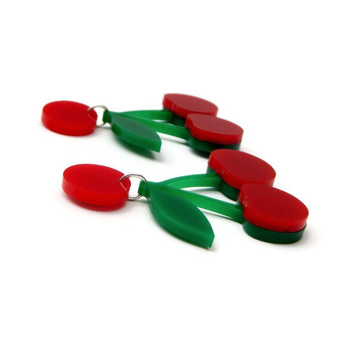 Fun and retro these large cherry earrings are laser cut from lightweight acrylic.