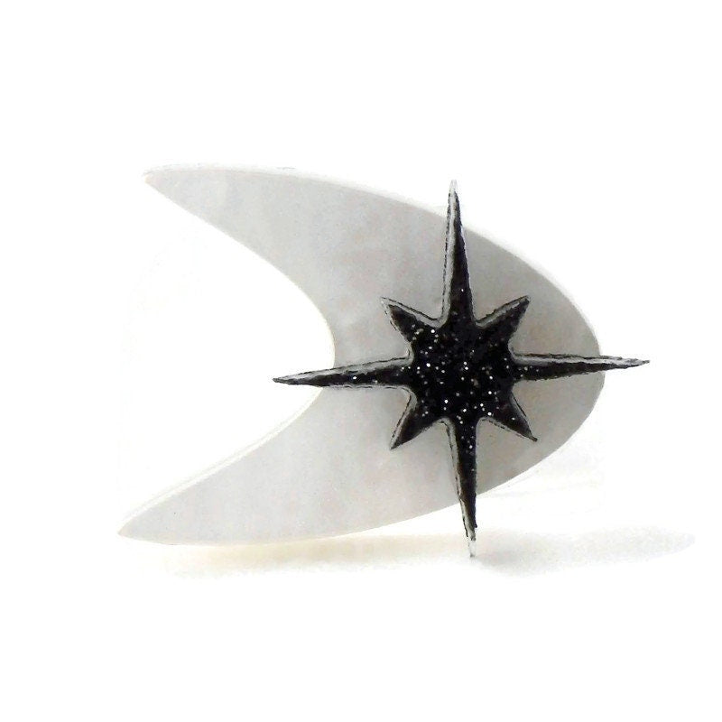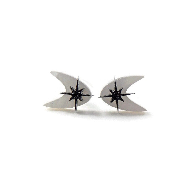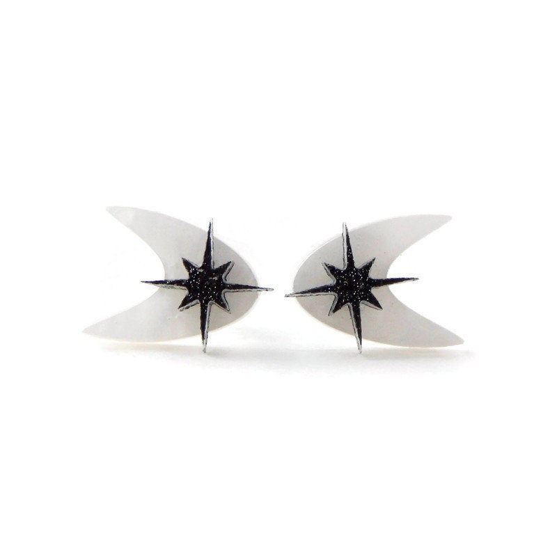These white boomerang and black starburst stud earrings are unique and retro. Laser cut from lightweight acrylic for maximum comfort and style without the added weight. This atomic 50s inspired design will add some vintage flair to any outfit, day or night. Laser cut from lightweight acrylic so they won't weigh you down. The white pearl and black glitter finish adds dimension and interest to these studs. Earring backs are nickel and lead free for sensitive ears.