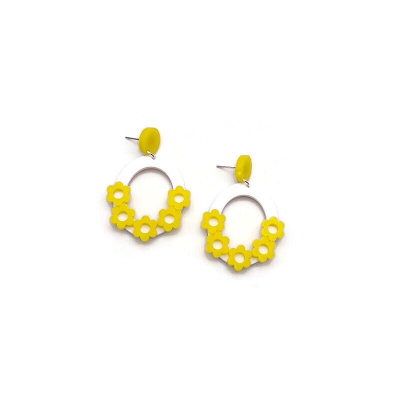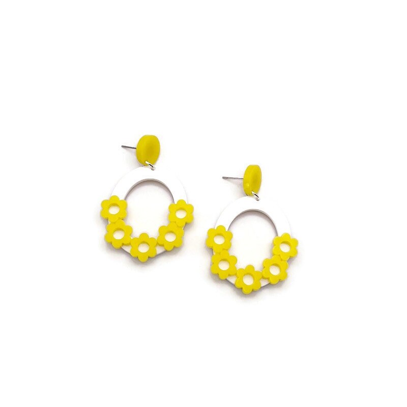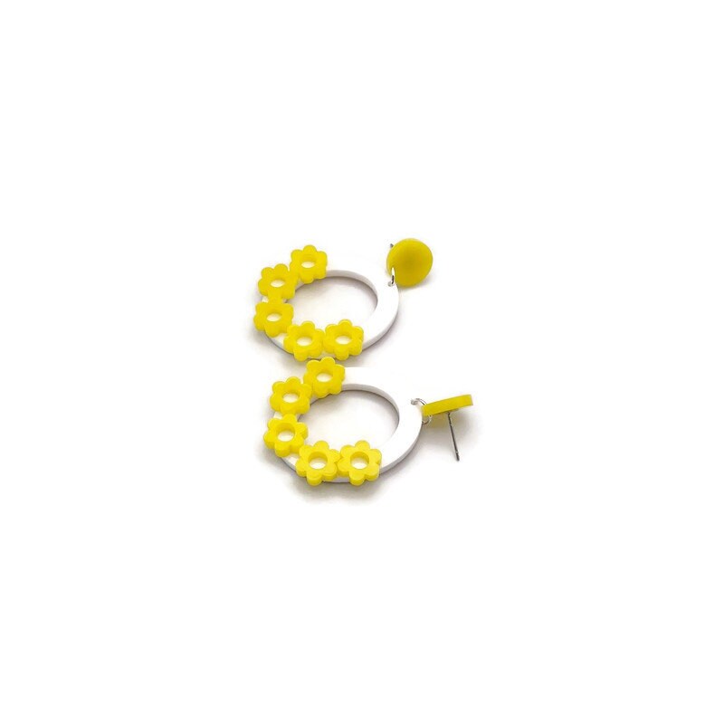 Make a big statement this summer with these vintage inspired yellow and white floral dangle hoops. Designed with lightweight yellow and white acrylic to stand out while being comfortable enough to wear all day.