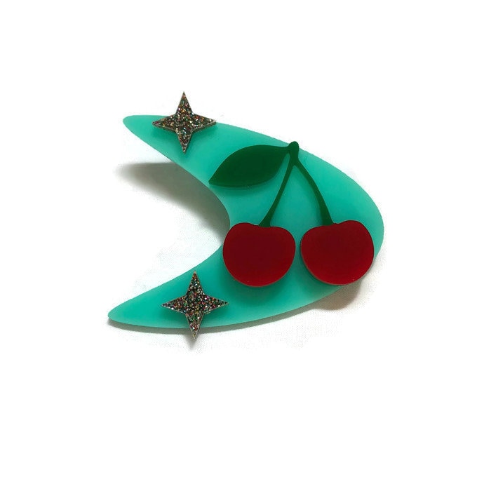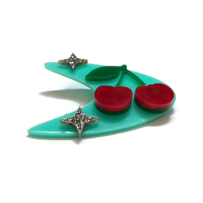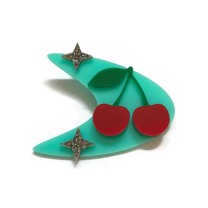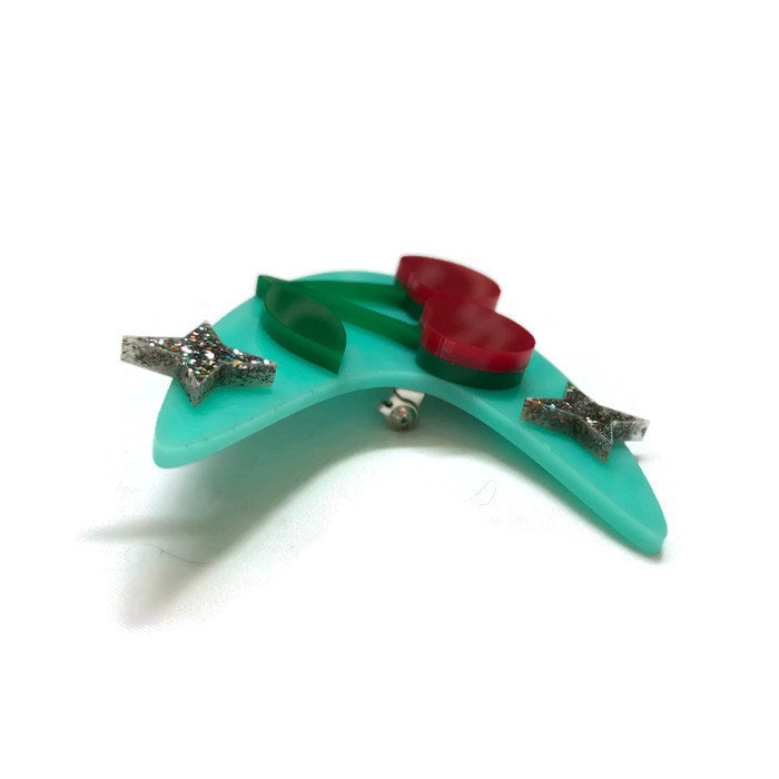 This rockabilly brooch is inspired by the atomic 50's. The laser cut acrylic aqua boomerang is adorned with laser cut acrylic cherries in red and green and two retro stars in multi colored glitter acrylic. The brooch measures approximately 56 mm x 73 mm (2.16 in x 2.87 in) and is backed with a pin back.