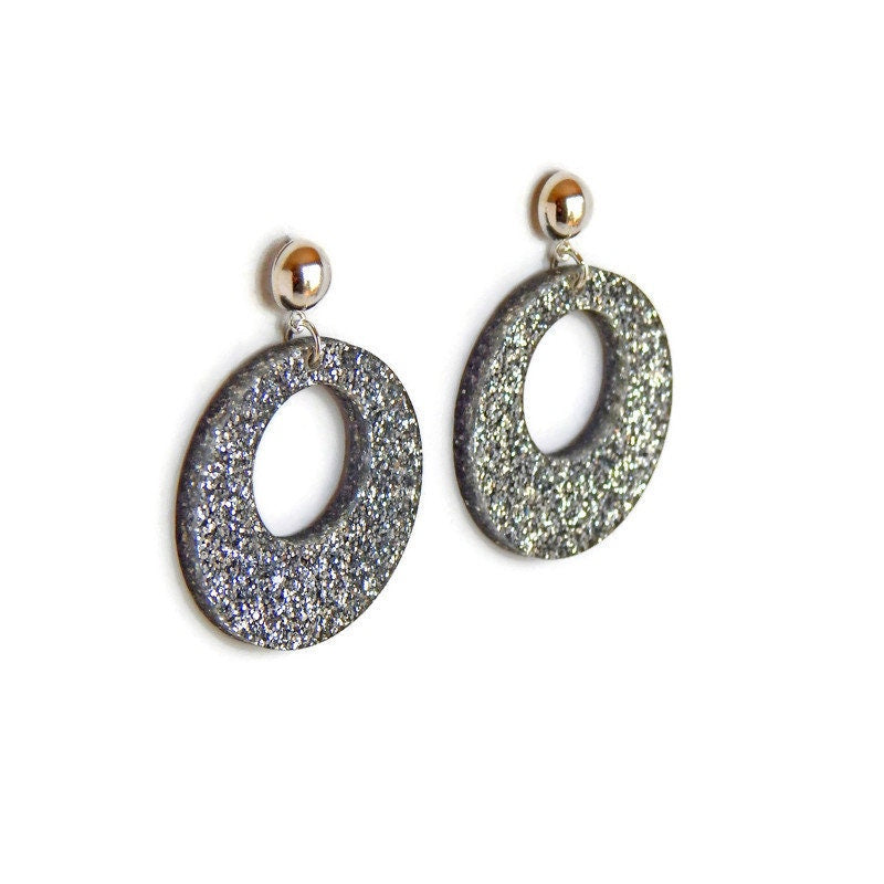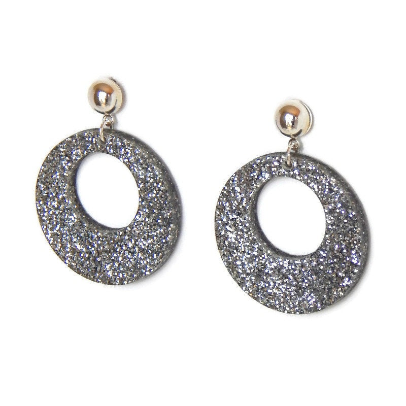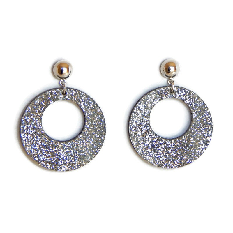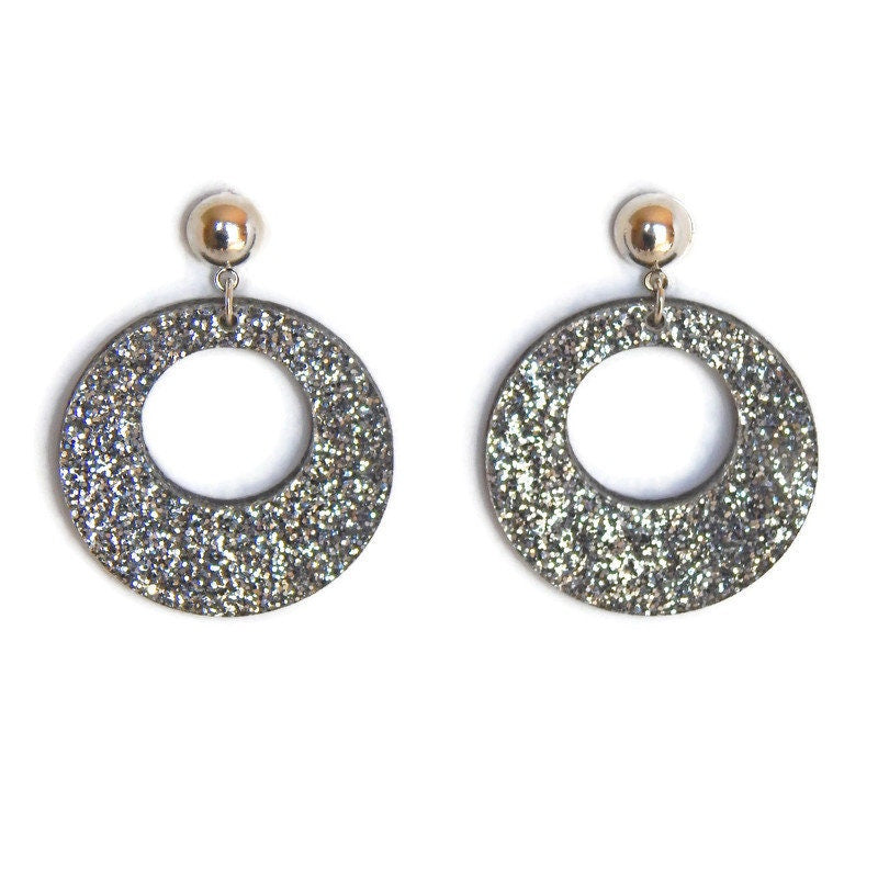 These dangling silver glitter hoop earrings are both retro and timeless. Made from lightweight acrylic for maximum comfort and style without the added weight. This classic design will add some vintage flair to any outfit, day or night. The silver glitter finish gives these earrings lots of sparkle and visibility.