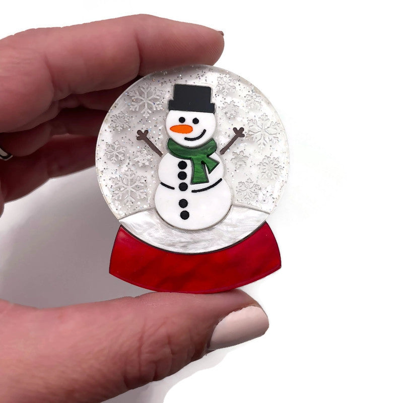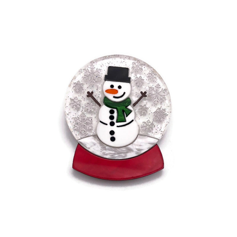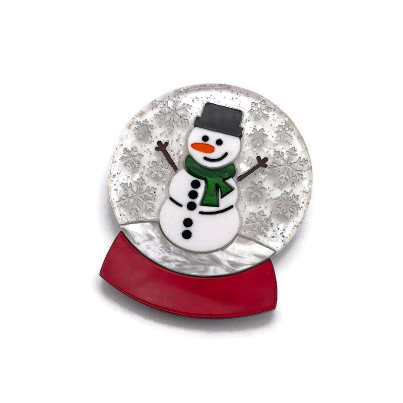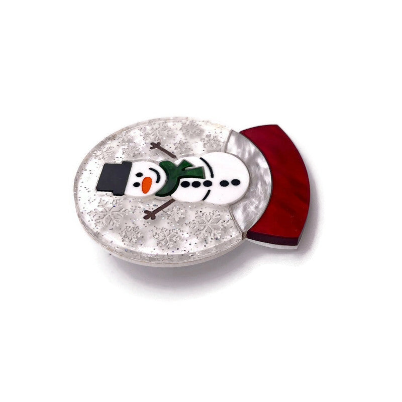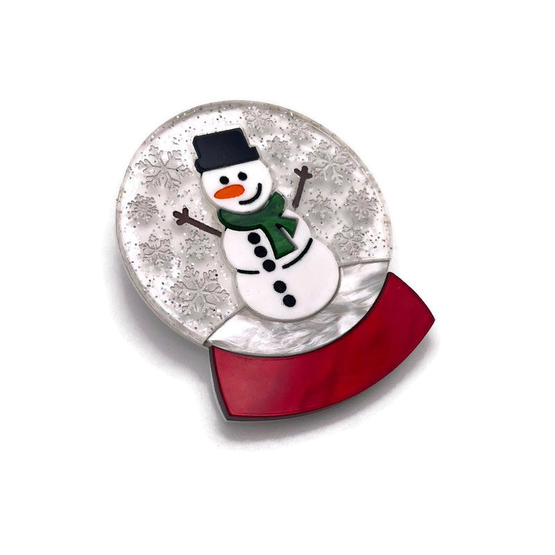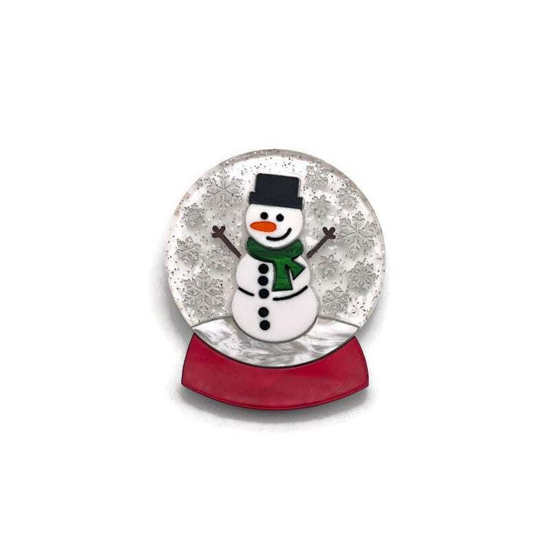 This adorable Snowman Snowglobe Brooch is a wearable winter wonderland that sure to add joy and whimsy to any outfit. Carefully handcrafted with multiple finishes of laser cut acrylic, this brooch features a charming snowman encased in a miniature snowglobe surrounded by sparkling snow.