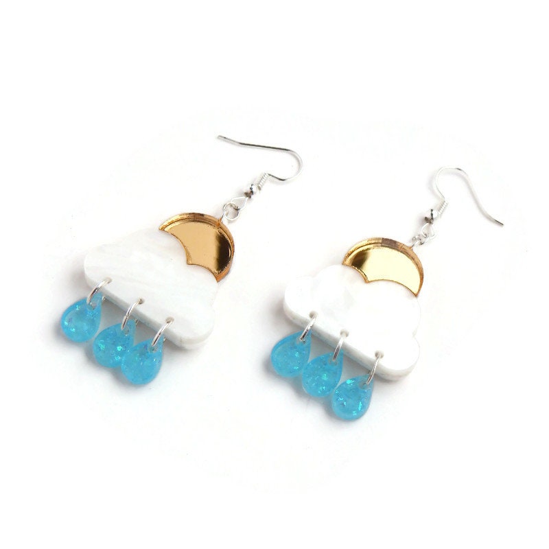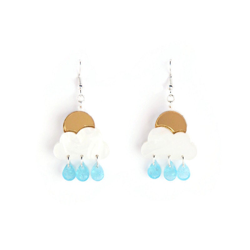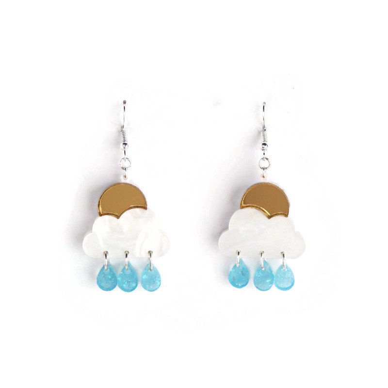 These beautifully handcrafted earrings are the perfect solution for fun fashion lovers who want to accessorize rain or shine. Created with the intention to bring beauty and joy no matter the weather, these earrings can brighten up the dreariest of days. Made with lightweight white pearl, gold mirror and blue glitter acrylic, these earrings are perfect to wear all day without ever having to worry about heavy earrings bringing you down.
