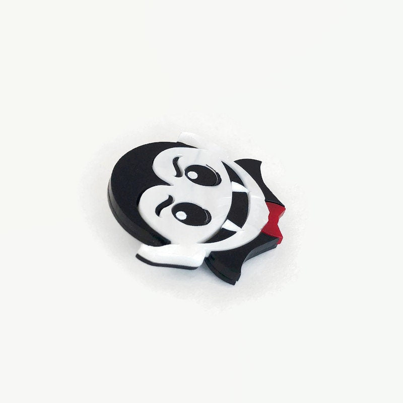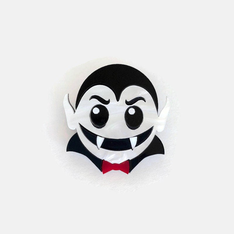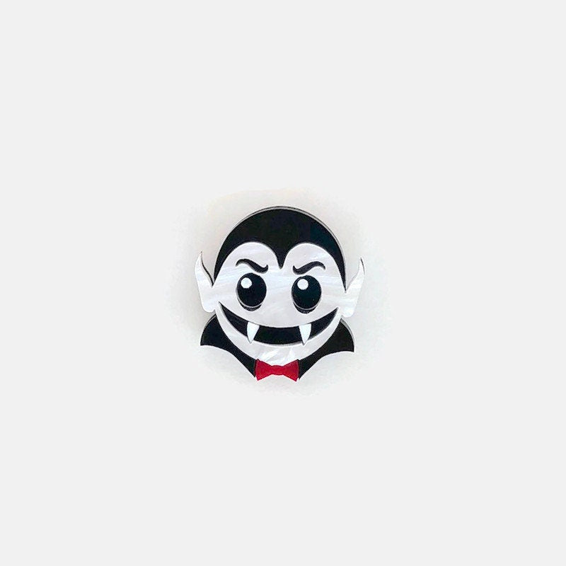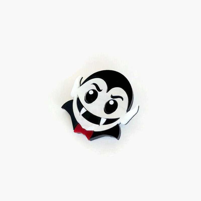 This cute vampire brooch is the perfect accessory to add some Halloween fun to your wardrobe. The monster is laser cut from black, red and pearl white acrylic with hand painted details. Made of double layered acrylic for sturdiness without added weight. Brooch measures about 2" wide by 2" tall and is backed with a brooch pin.