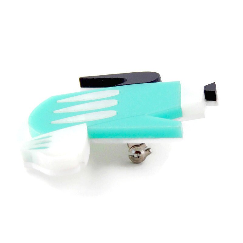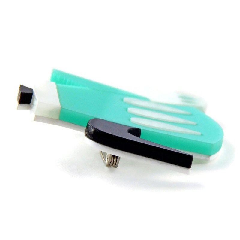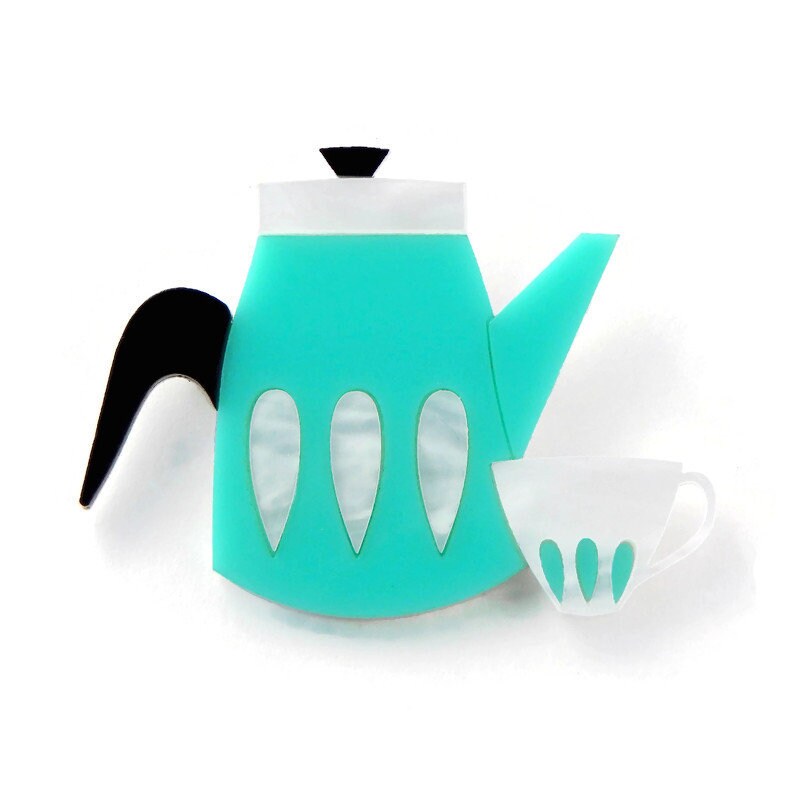 Add some vintage novelty to your wardrobe with this mid century modern coffee (or tea) pot brooch. The coffee pot is made of aqua colored acrylic with white pearl and black acrylic details and sits next to coordinating white pearl and aqua coffee cup. The brooch measures approximately 2 inches tall and 2.75 inches wide and is backed with a pin back.