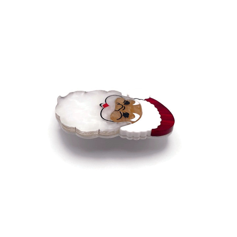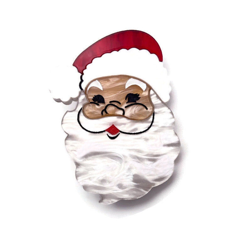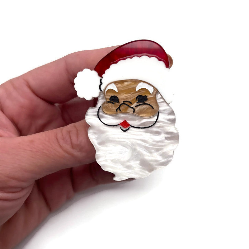 Embrace the Holiday spirit with this vintage inspired Santa Claus brooch. Crafted from laser cut acrylic, this festive brooch combines nostalgic charm and modern style. This brooch is laser cut from red pearl, white pearl, tan pearl and white acrylic, lovingly hand assembled and finished with hand painted details.