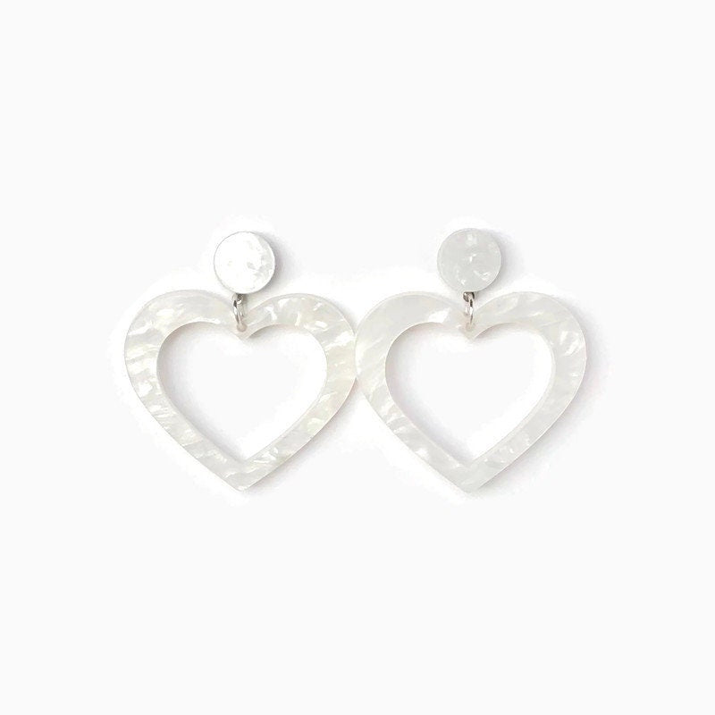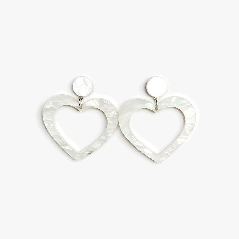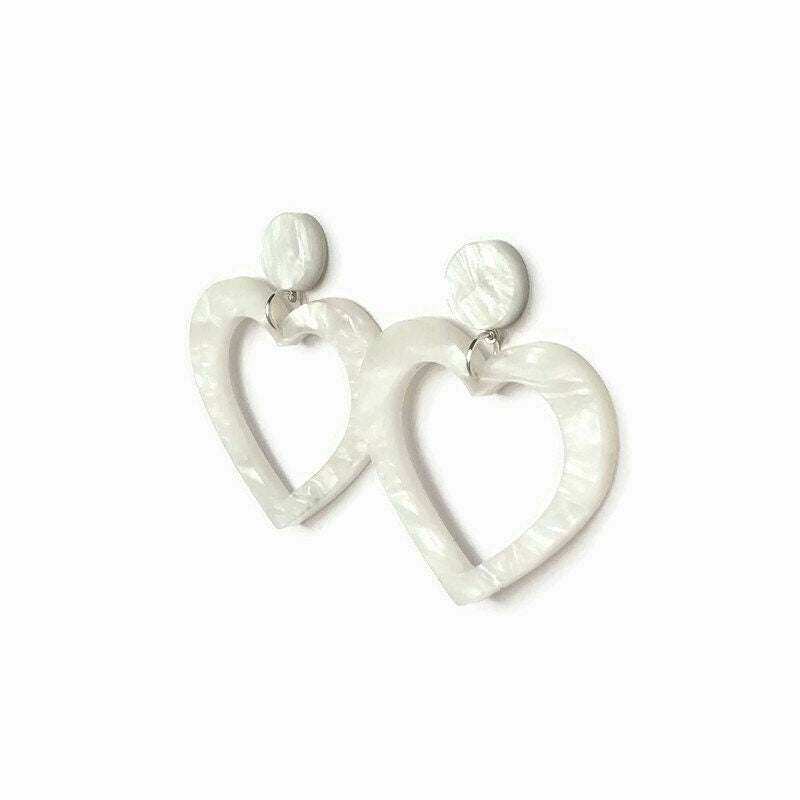 Share the love with these dangly heart cut out earrings. This fun and flirty design adds some unique style to any outfit, day or night. These earrings are made from laser cut white marbled acrylic so although large in size, they are light and comfortable on your ear.