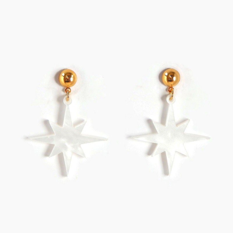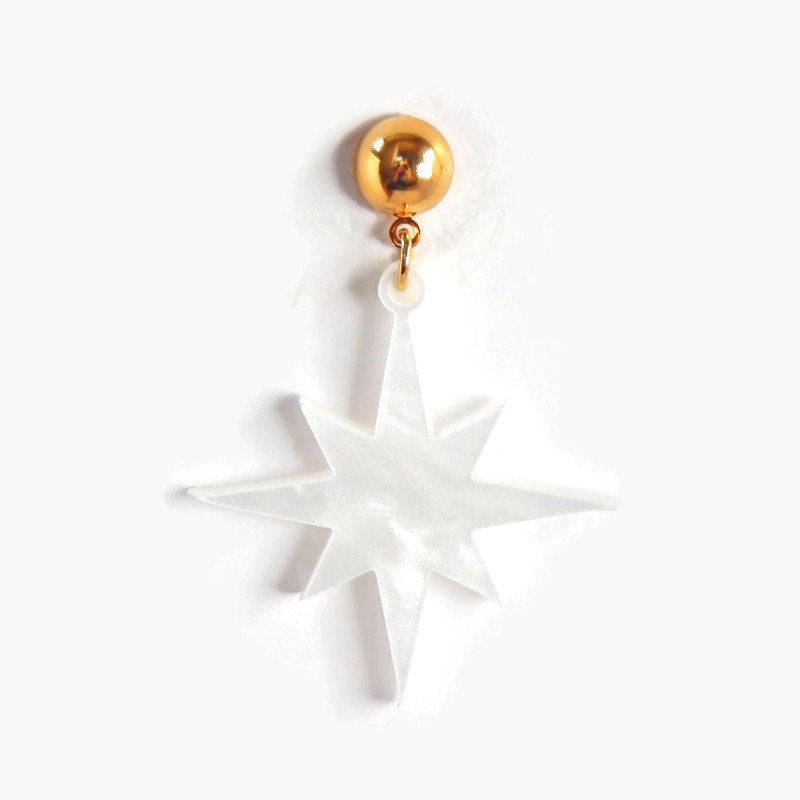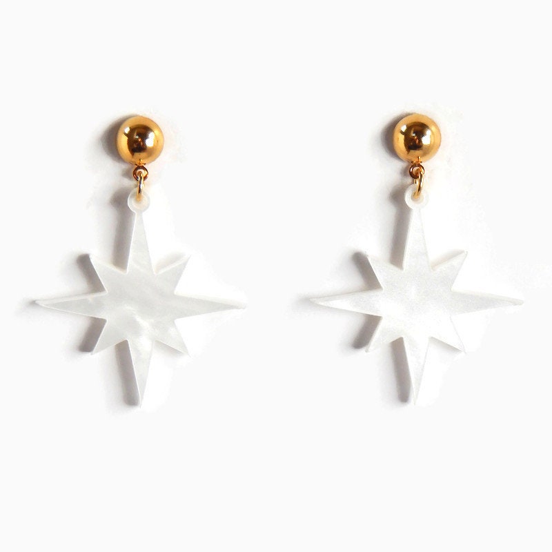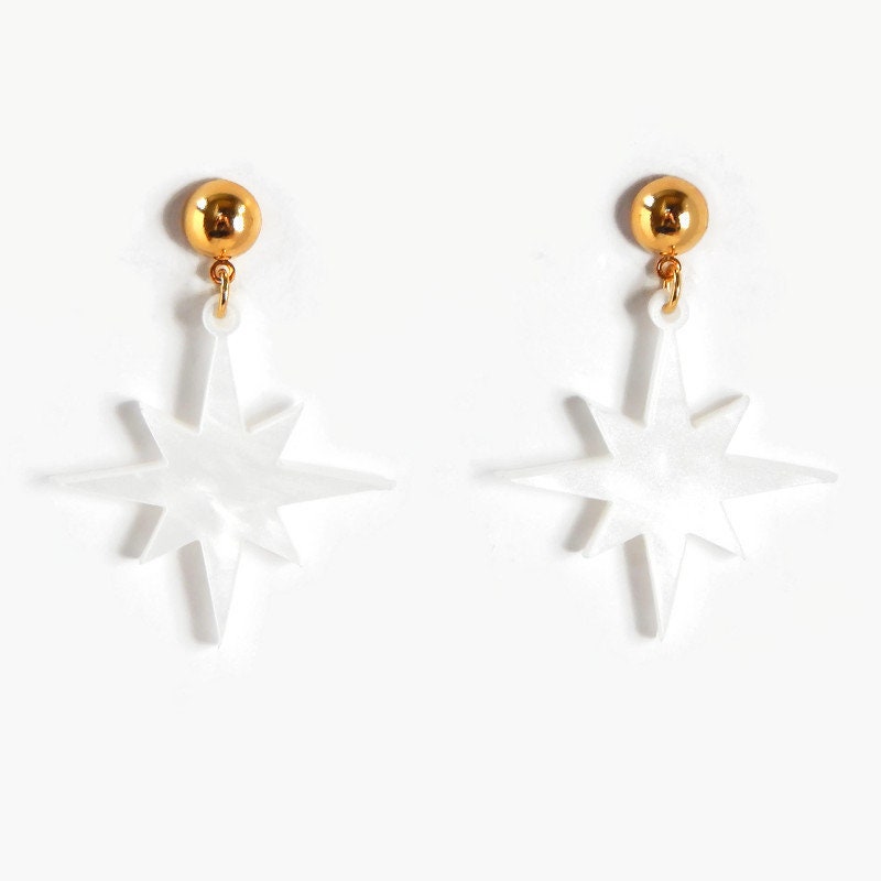 Flaunt your retro style with these 1950s inspired atomic starburst earrings. These mid century inspired star dangle earrings will add some vintage flair to any outfit, day or night. Made of blue pearl acrylic sure to get attention. The laser cut design is so lightweight you will forget you are wearing them and hangs from your choice of a gold or silver tone half ball stud. The comfort clutch style earring backs keep the earring snug to your ear so they don't pull or droop.