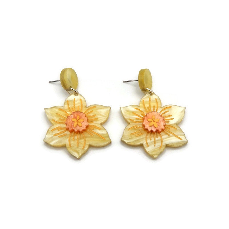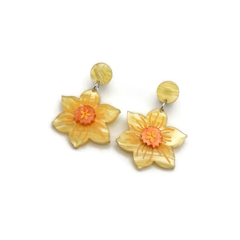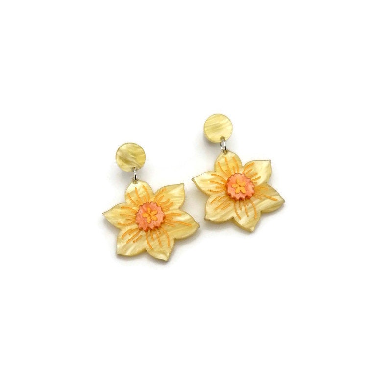 These beautiful yellow daffodil earrings are the perfect earrings to add a touch of springtime cheer to any outfit. Made with multi layered yellow and orange laser cut acrylic making them lightweight and easy to wear. Laser cut acrylic is engraved, hand assembled and finished with hand painted details. The yellow and orange pearl finish are perfect for spring and will add a pop of color to any outfit.