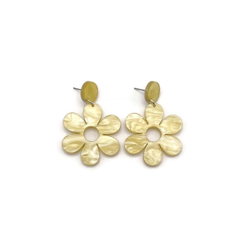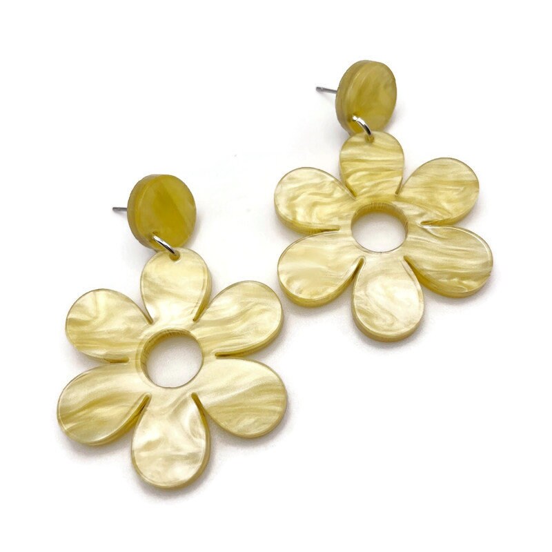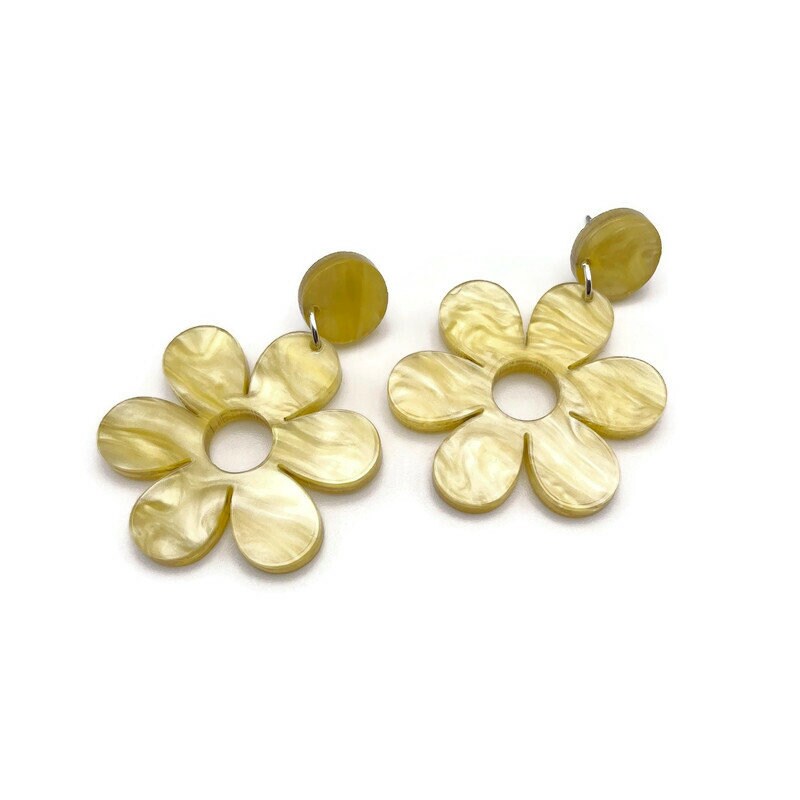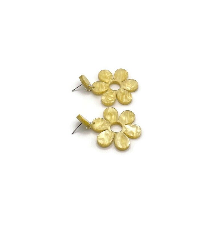 Stand out in a crowd with these yellow mod daisy statement earrings. Made from yellow pearl acrylic these spring earrings have a cool, funky vintage vibe and make the perfect addition to your spring wardrobe. Laser cut from lightweight acrylic making them comfortable to wear all day long.